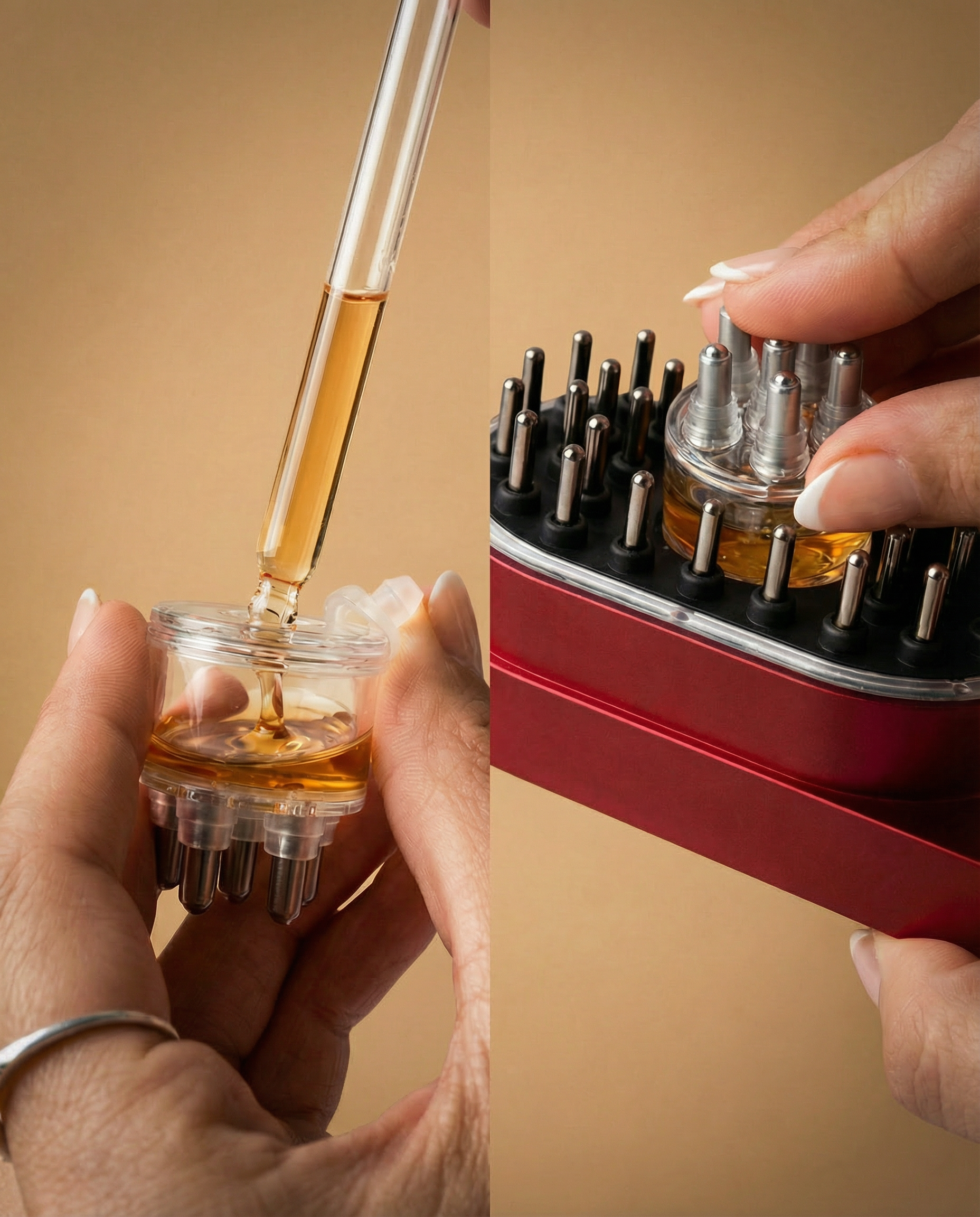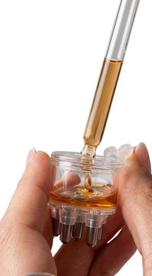 An innovative pod system that holds your chosen serum or oil and delivers it evenly through the bristles as you glide across your scalp and hair.