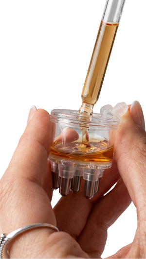 An innovative pod system that holds your chosen serum or oil and delivers it evenly through the bristles as you glide across your scalp and hair.