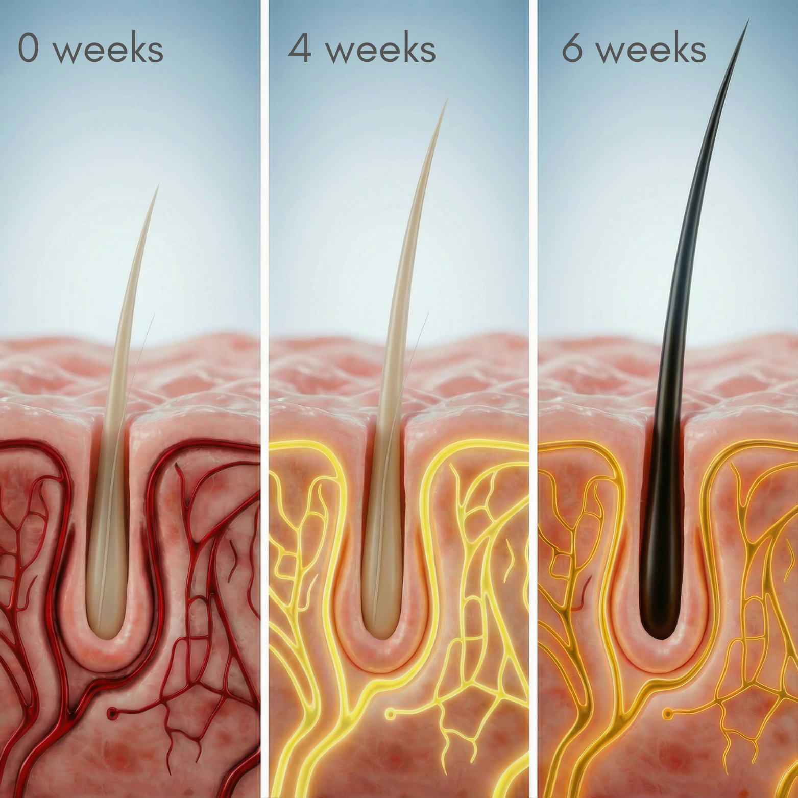 Proven wavelength that activates dormant follicles, boosts ATP production in cells, and promotes visibly thicker, healthier hair growth from within.